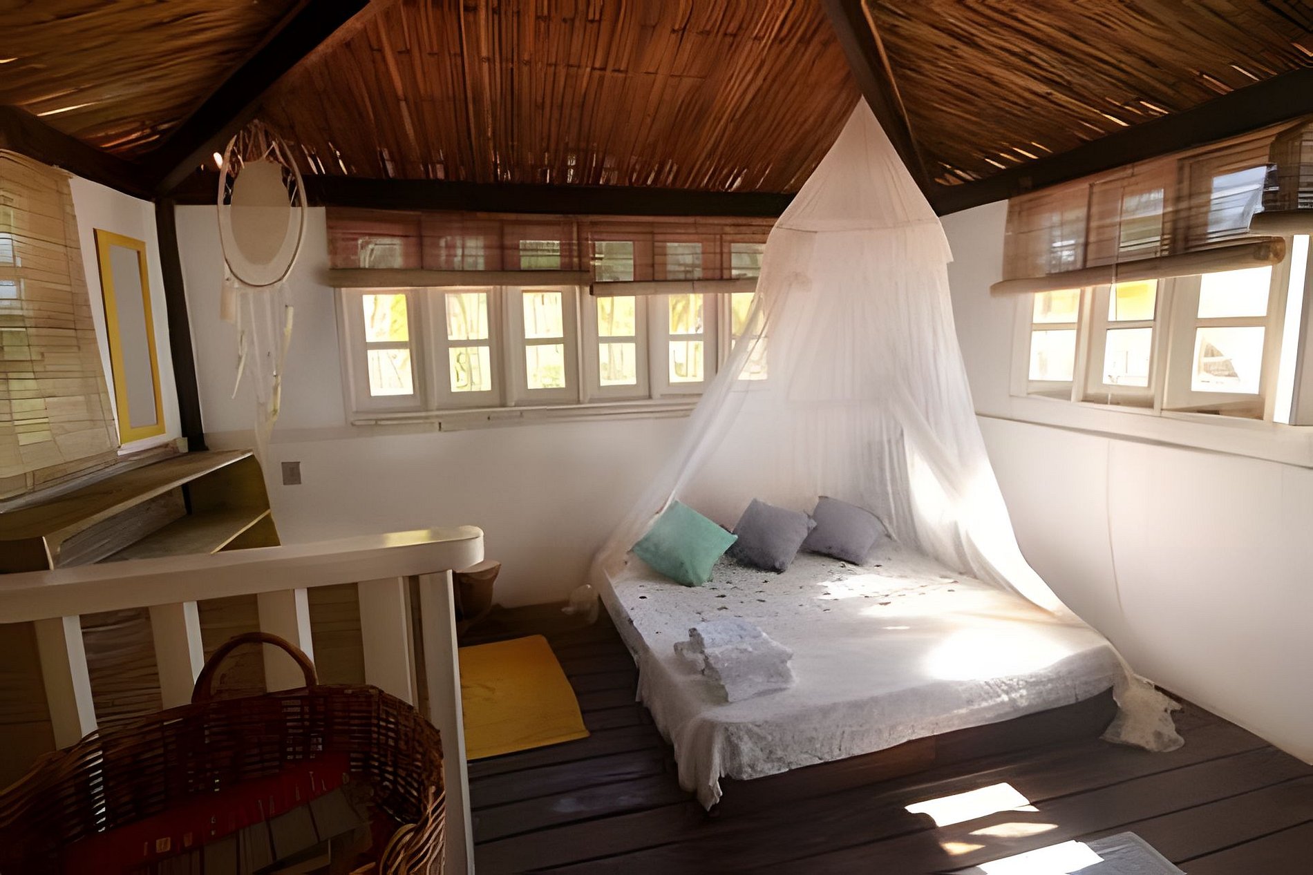 A casa Principal oferece um quarto no segundo andar. Na parte térrea da casa temos duas suítes. A sala integrada com a cozinha e um banheiro completo. Varanda na frente do mar e a outra com mesa para refeições com vista do coqueiral e para o rio, delicioso para banho. E temos na propriedade o Chalé Casa Capela, um quarto no andar superior No térreo saleta, banheiro e varanda. Redes nas varandas, nos quiosques A casa por sua proximidade do mar é climatizada pela constante brisa. Uma maravilha! Oferece serviço pela manhã e limpeza todos os dias, menos domingo. Roupas de cama e banho de algodão com trocas disponíveis. Os caseiros vivem na propriedade.