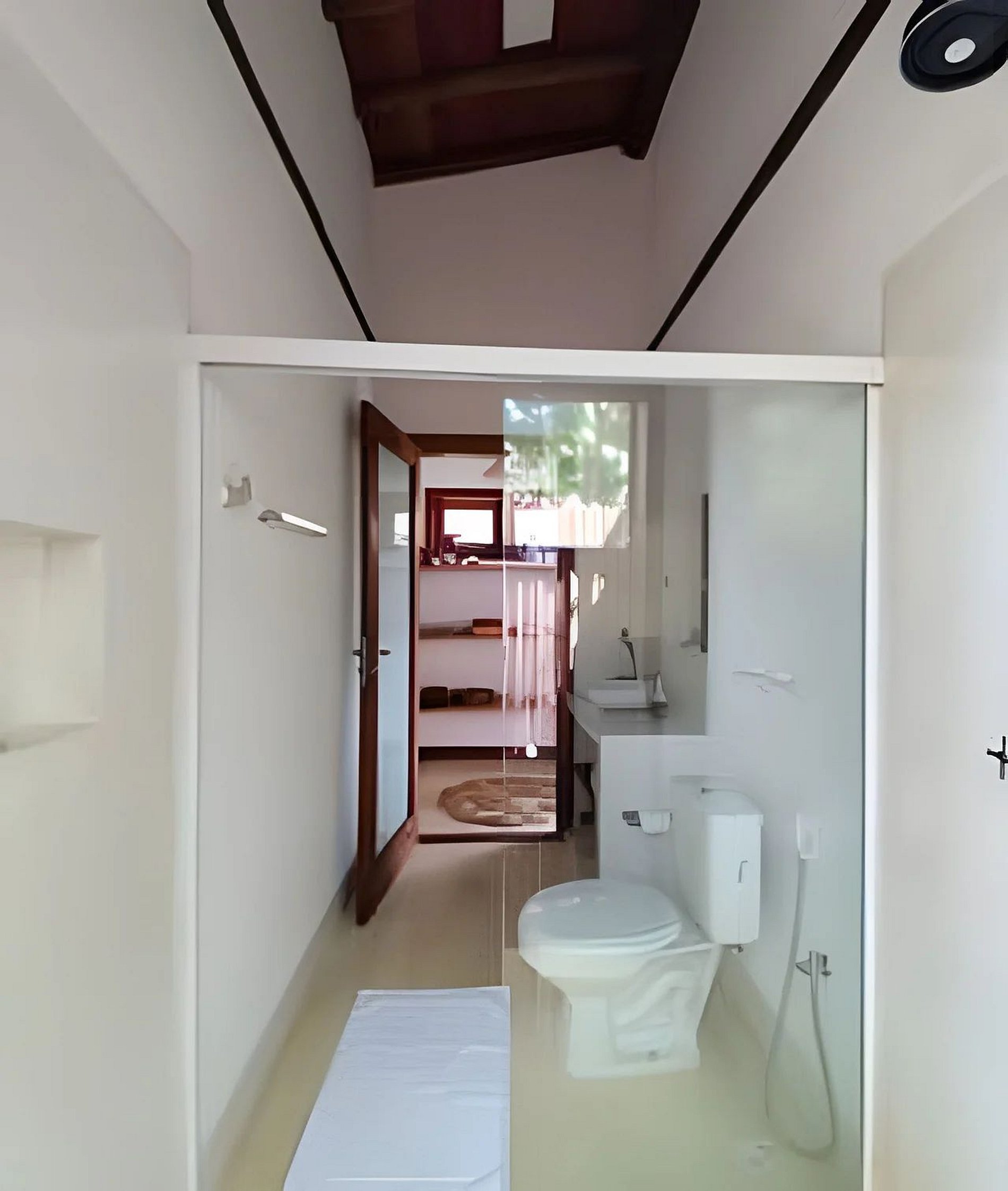 Banheiro com chuveiro a gás e acesso a ducha externa.