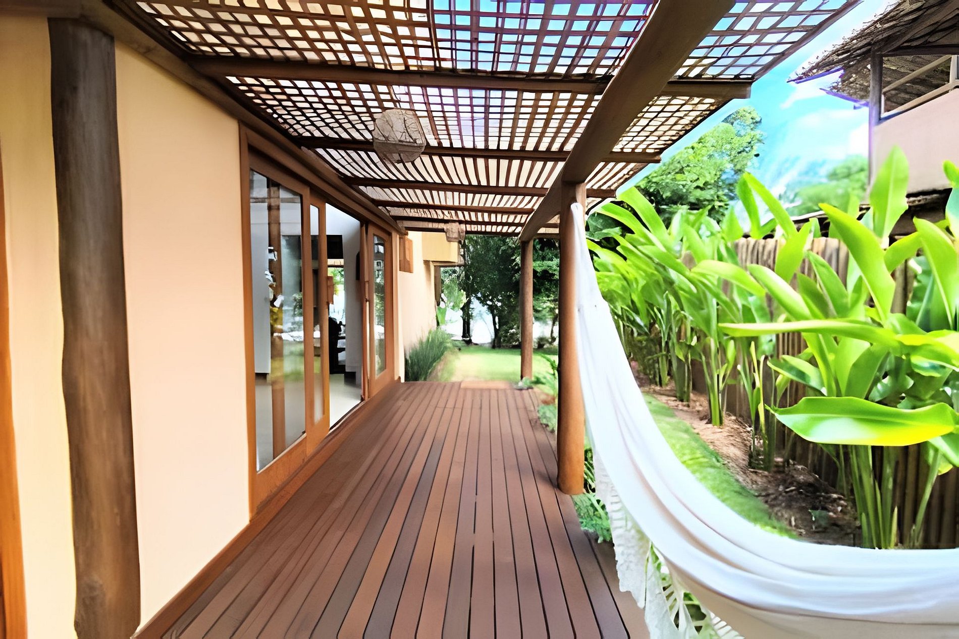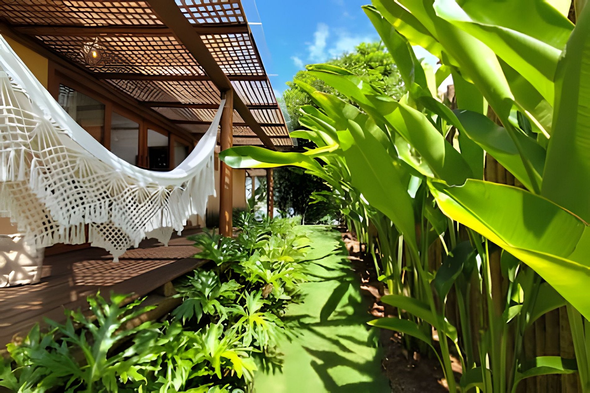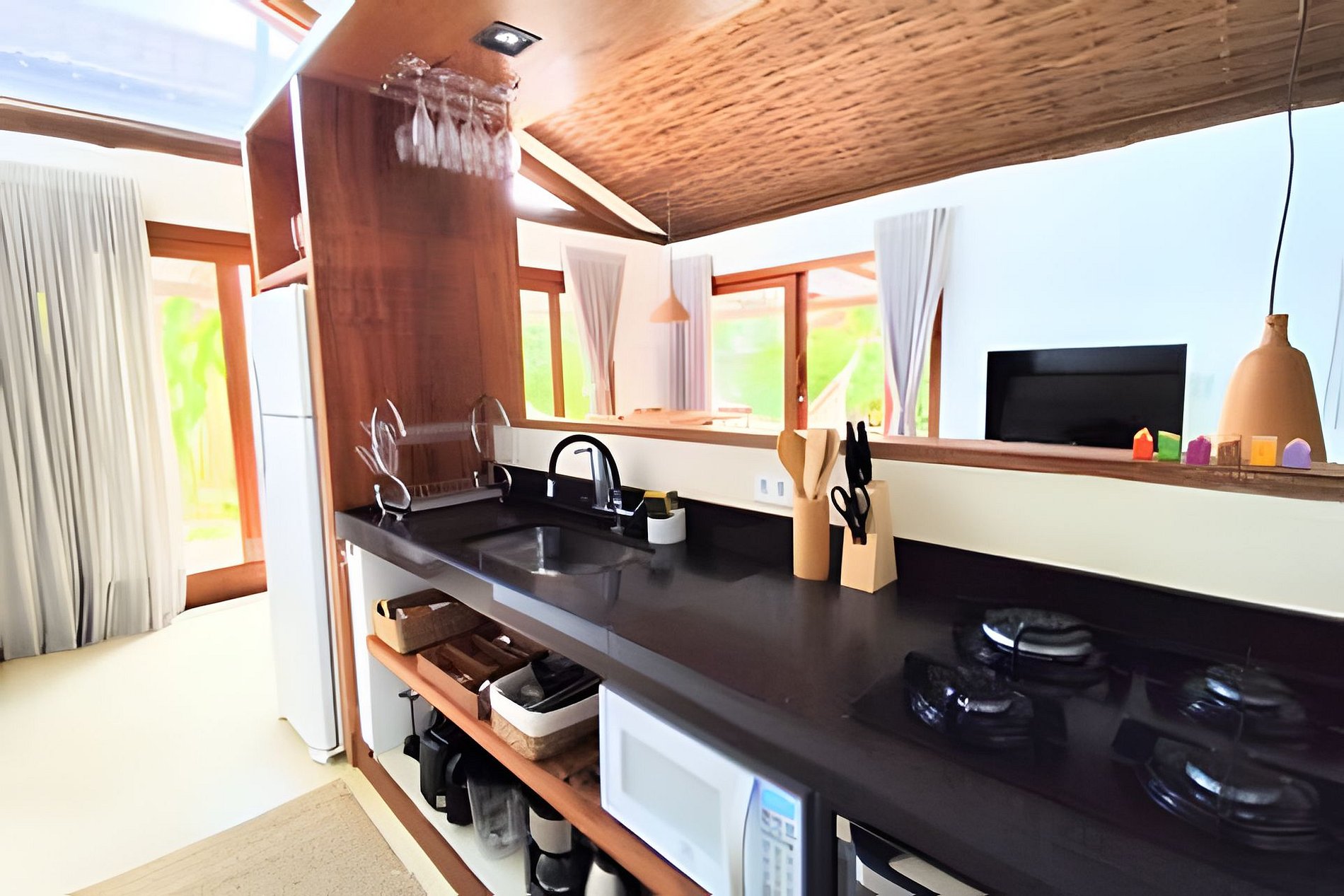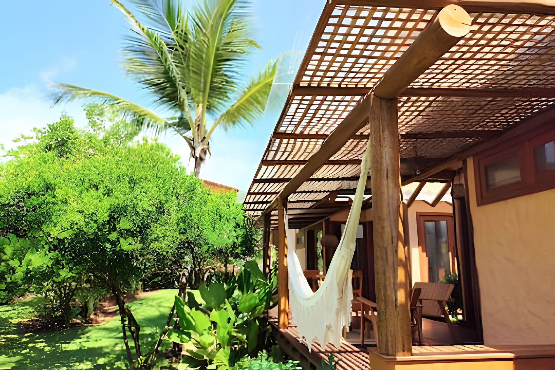 A Casa Dendê envolvida pelo jardim e varanda com redes. Possui cozinha americana bem equipada, com todas as comodidades para quem aprecia preparar suas refeições.