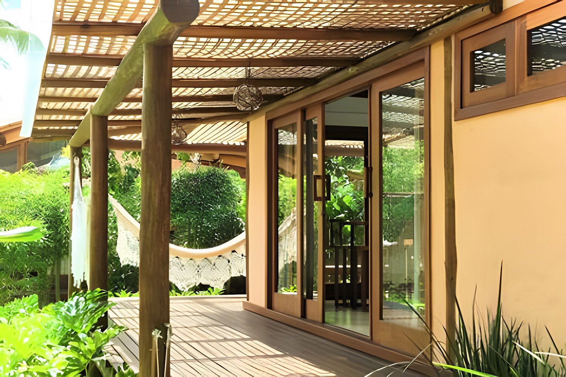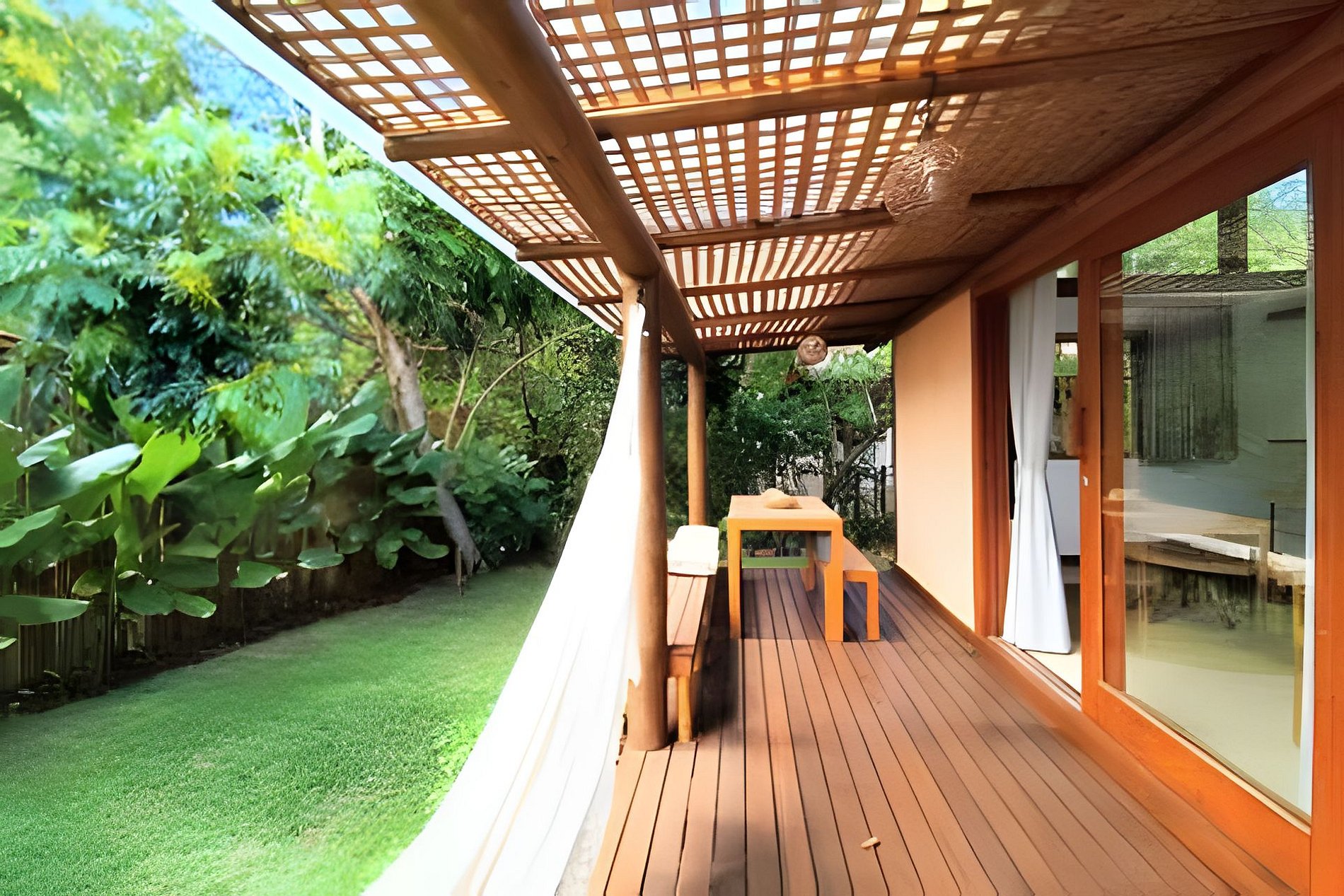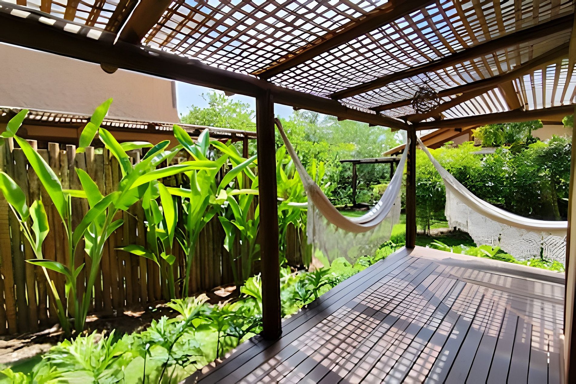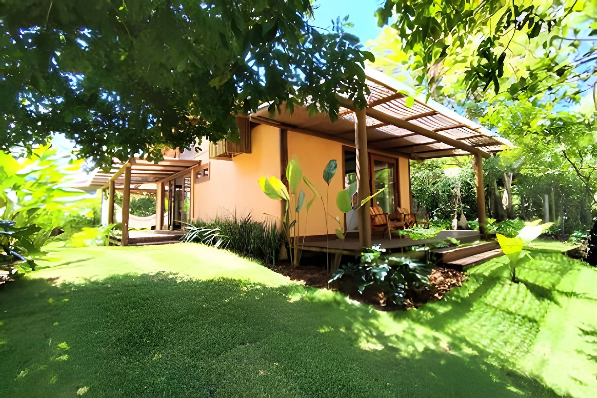 A Casa Dendê envolvida pelo jardim e varanda com redes. Possui cozinha americana bem equipada, com todas as comodidades para quem aprecia preparar suas refeições.