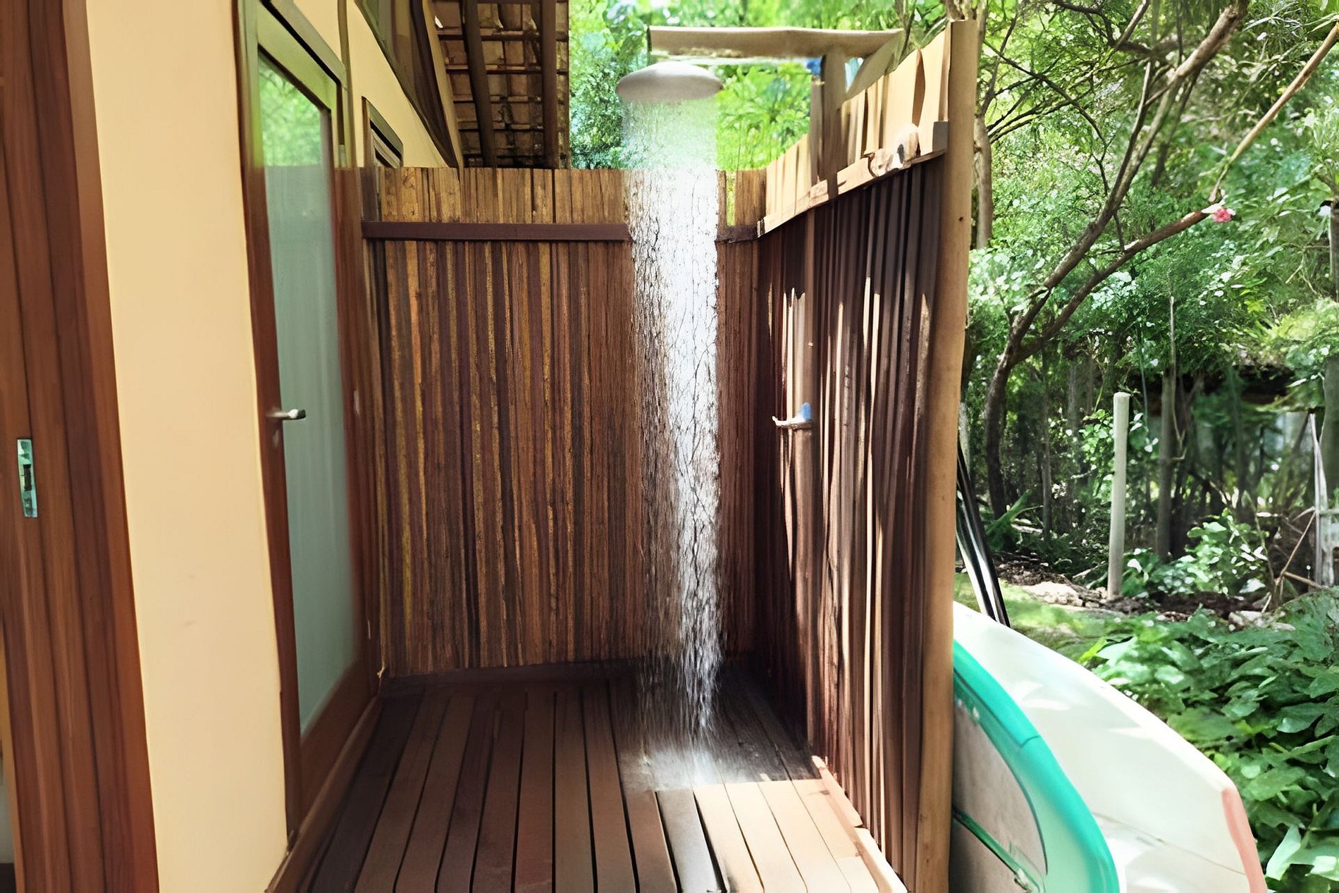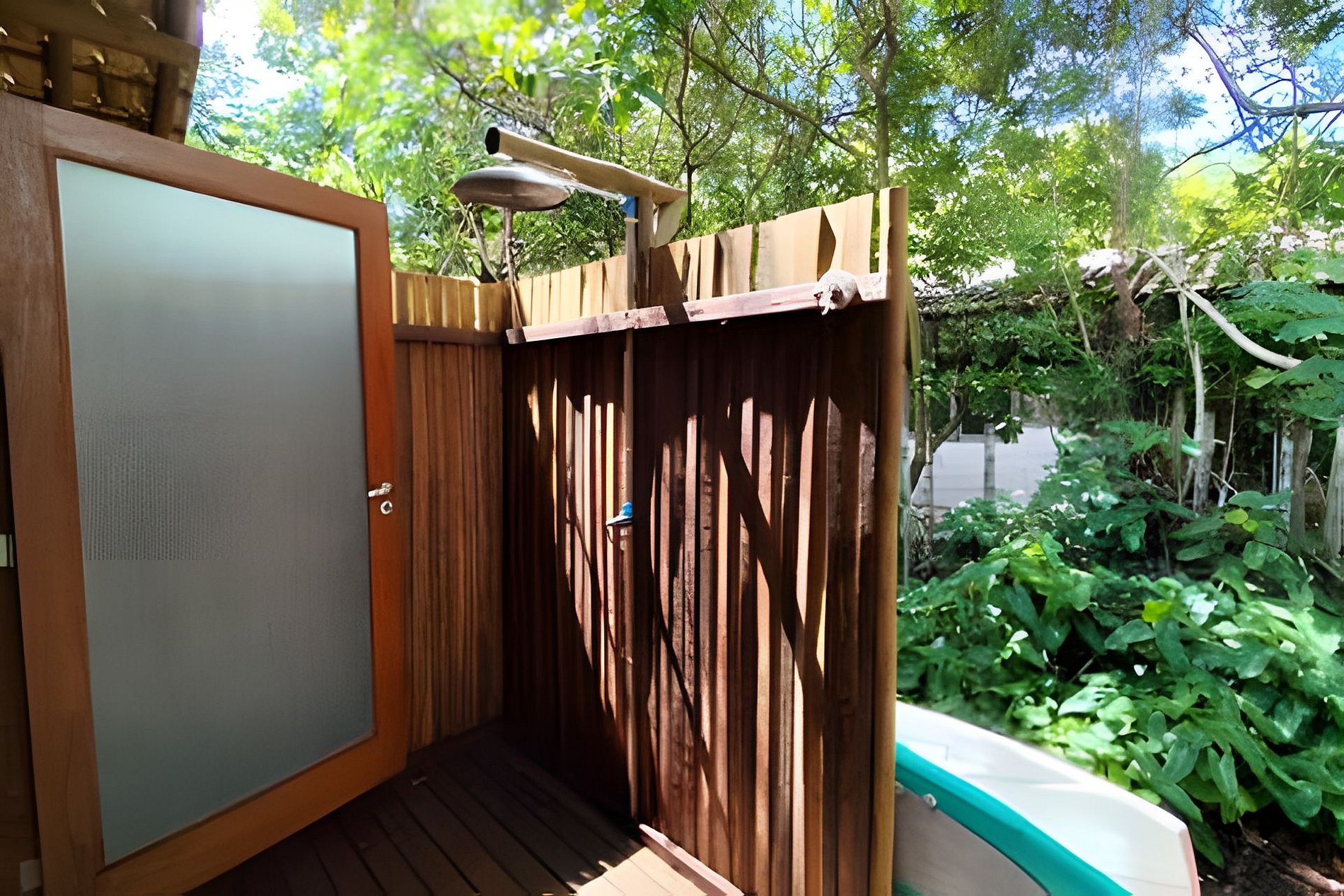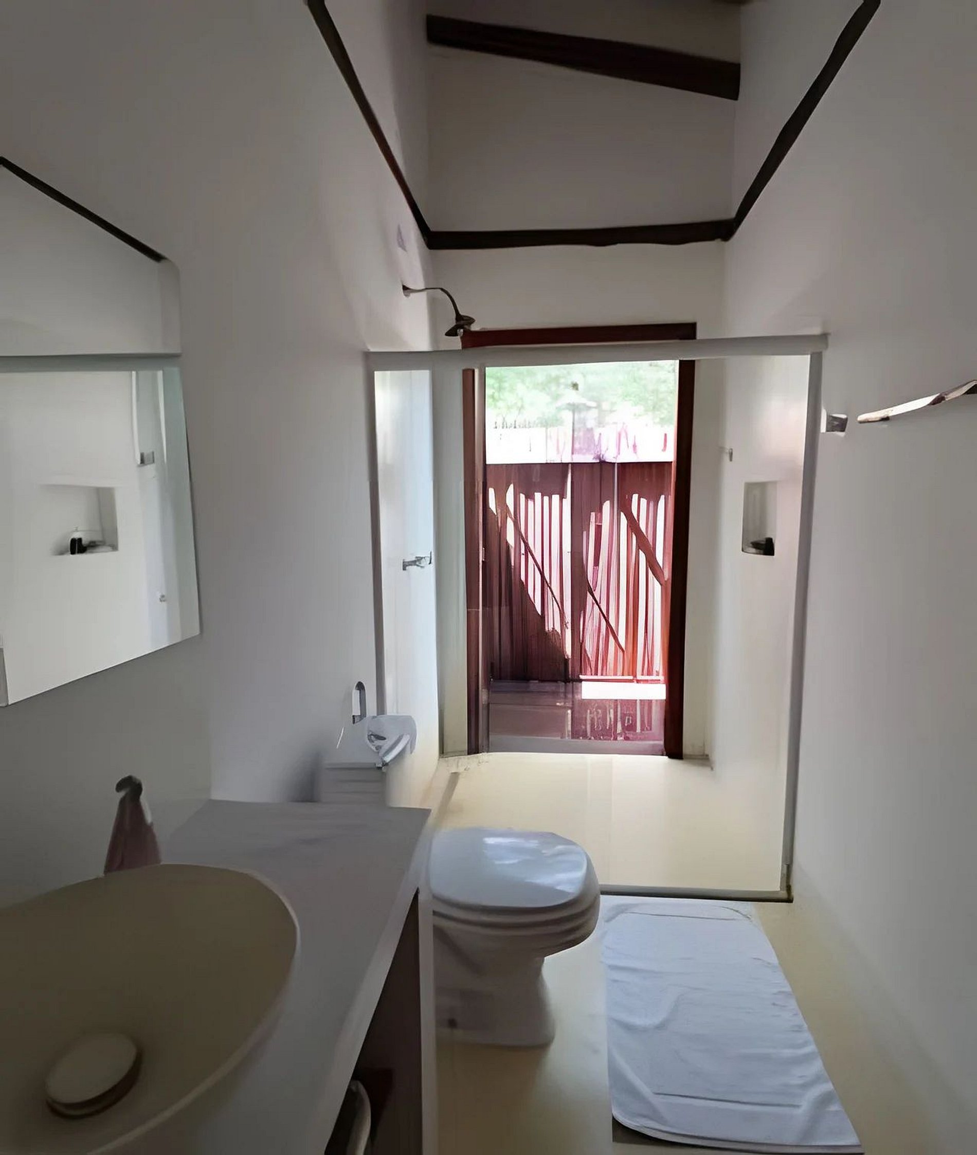 Banheiro com chuveiro a gás e acesso a ducha externa.