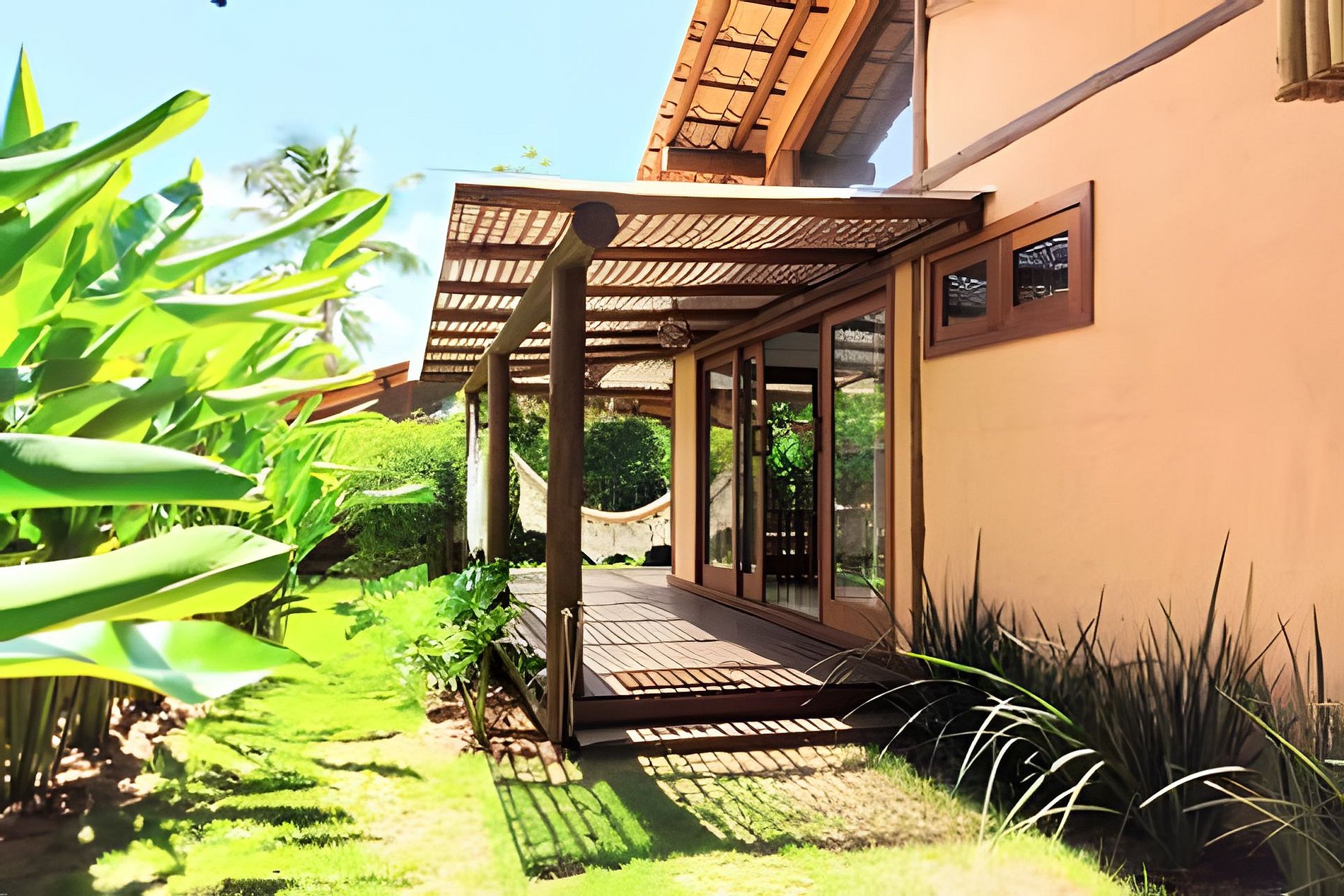 Em meio a um jardim de plantas tropicais.